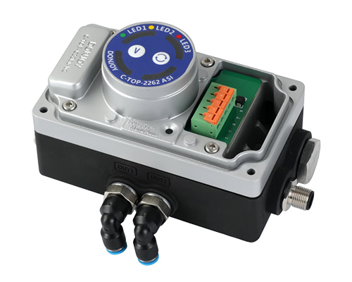 C-TOP-2262是一款本安防爆設計的閥門控制單元,它接收來自PLC/DCS或其他自控系統指令進行工作,同時反饋當前閥門位置信號到PLC/DCS等自控系統,也可通過IO-Link、AS-I V3.0版本總線通訊。每個位置都會通過不同位置顏色LED燈顯示當前狀態。